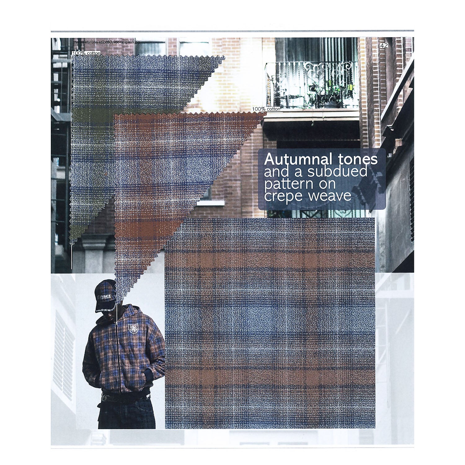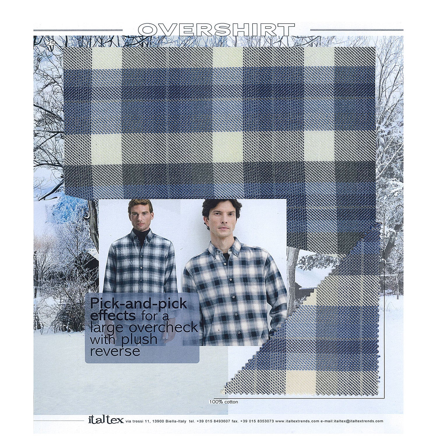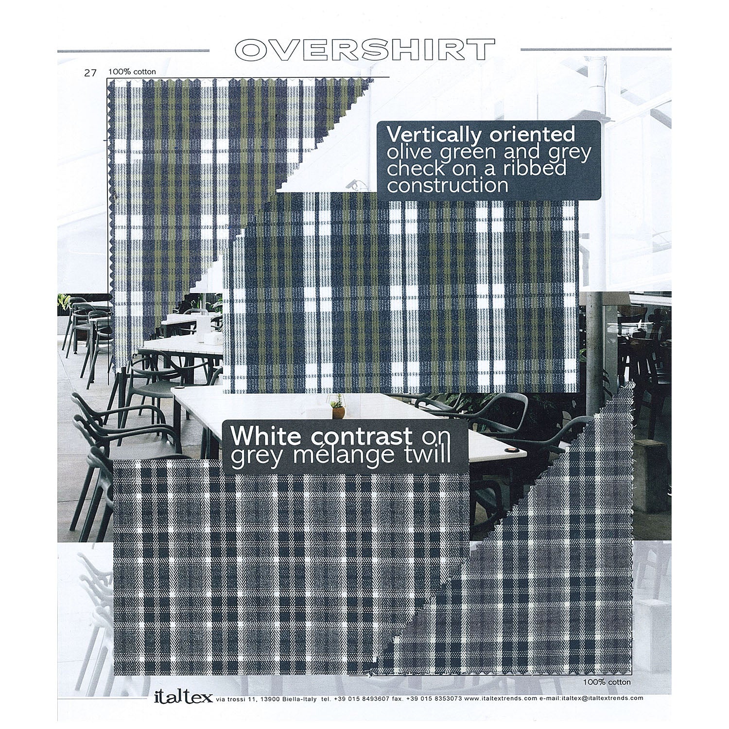 The fashion trend book specific for overshirt fabrics for the Autumn/Winter 2027/28 season is the result of the strong trend towards a sporty and comfortable style, which led to the development of new qualities and shapes. A style mainly made up of wide-repeat checks and plaids, as well as smaller patterns and special constructions, interpreted in the trendiest colours.