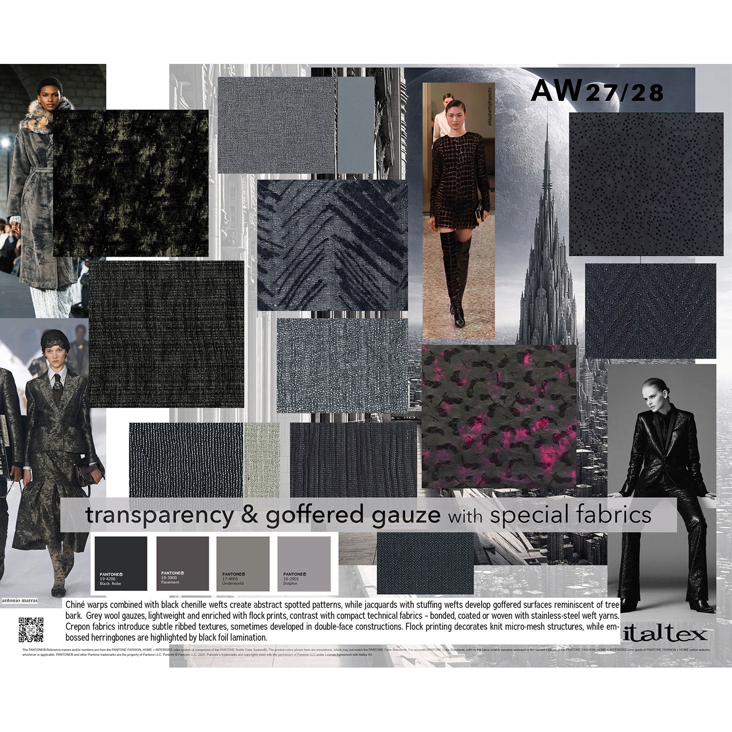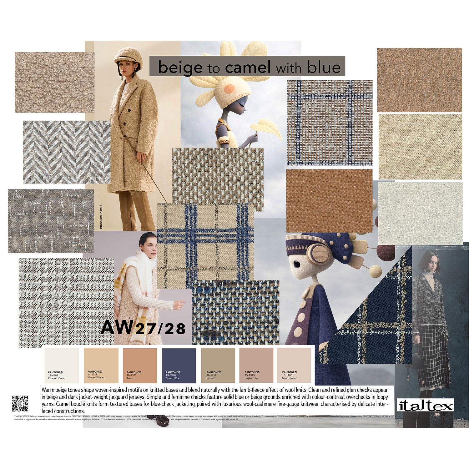 Assembled by Italtex Trends experts, the womenswear AW27/28 mood boards cover 92 colours accompanied by their Pantone® codes for a wide range of woven and knitted fabrics, also jacquard. Each card is accompanied by a detailed description of the fabric and colour trends presented, including the most popular fibres, yarns, constructions, patterns, and finishes.