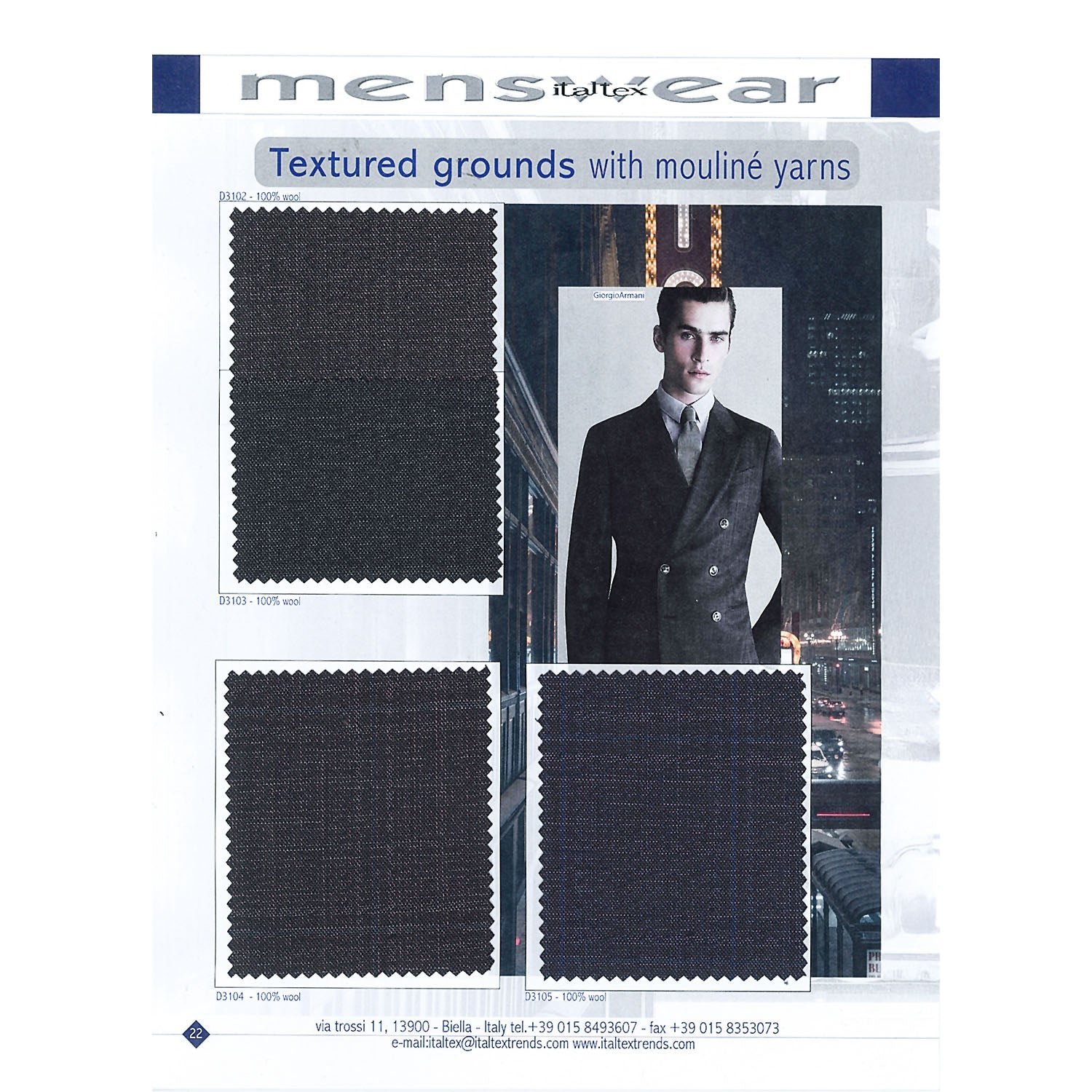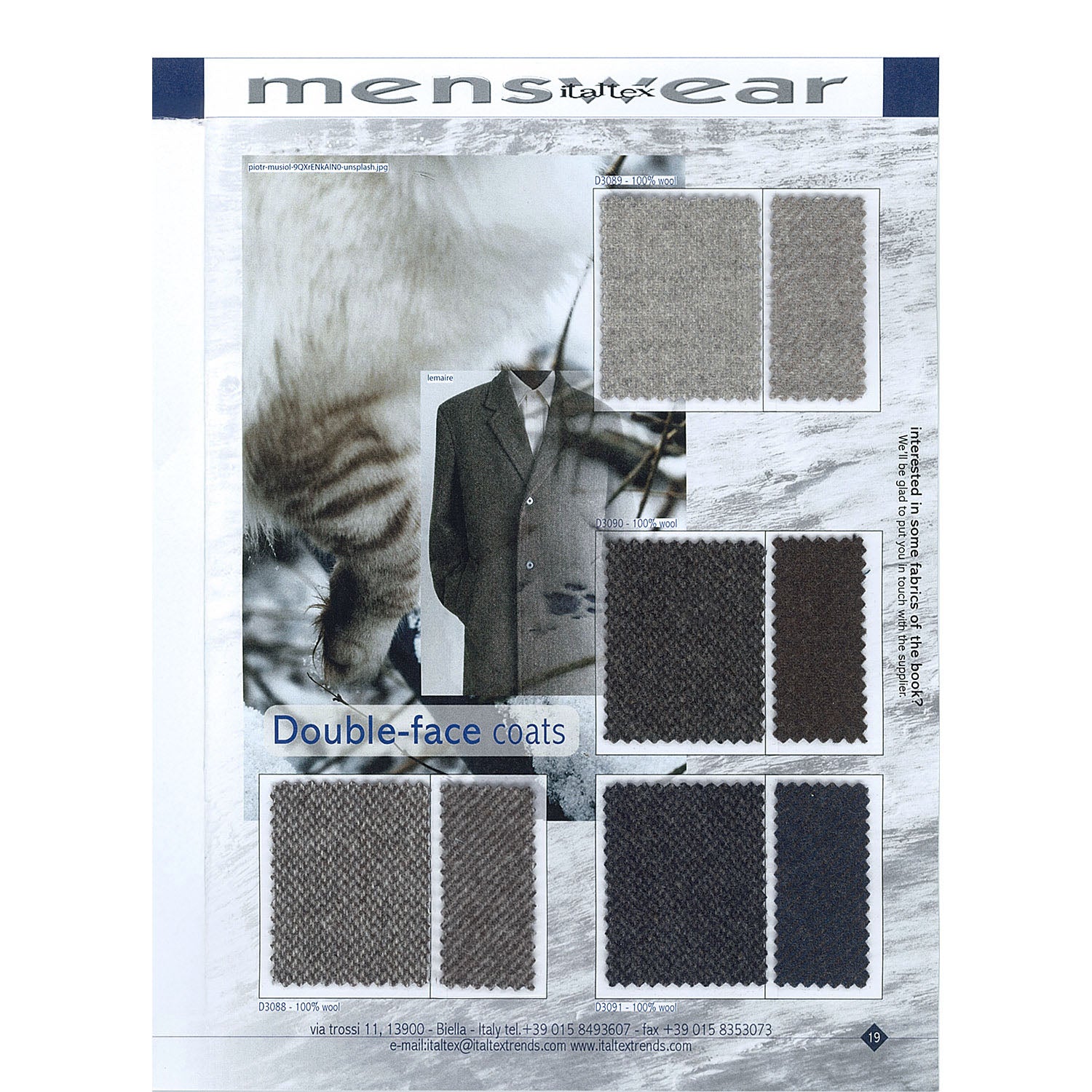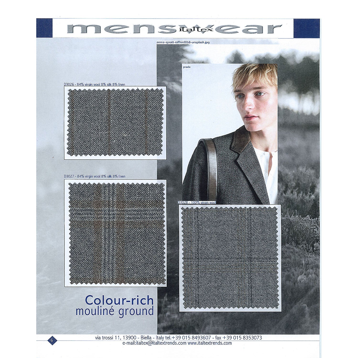 Al suo interno sono inclusi campioni di tessuti in essere selezionati dagli esperti di Italtex Trends, che presentano composizioni, filati, costruzioni, disegni e finissaggi per giacche, pantaloni, abiti e cappotti da uomo. I 74 nuovi colori della stagione sono inclusi in una cartella colori corredati dai relativi codici Pantone®.