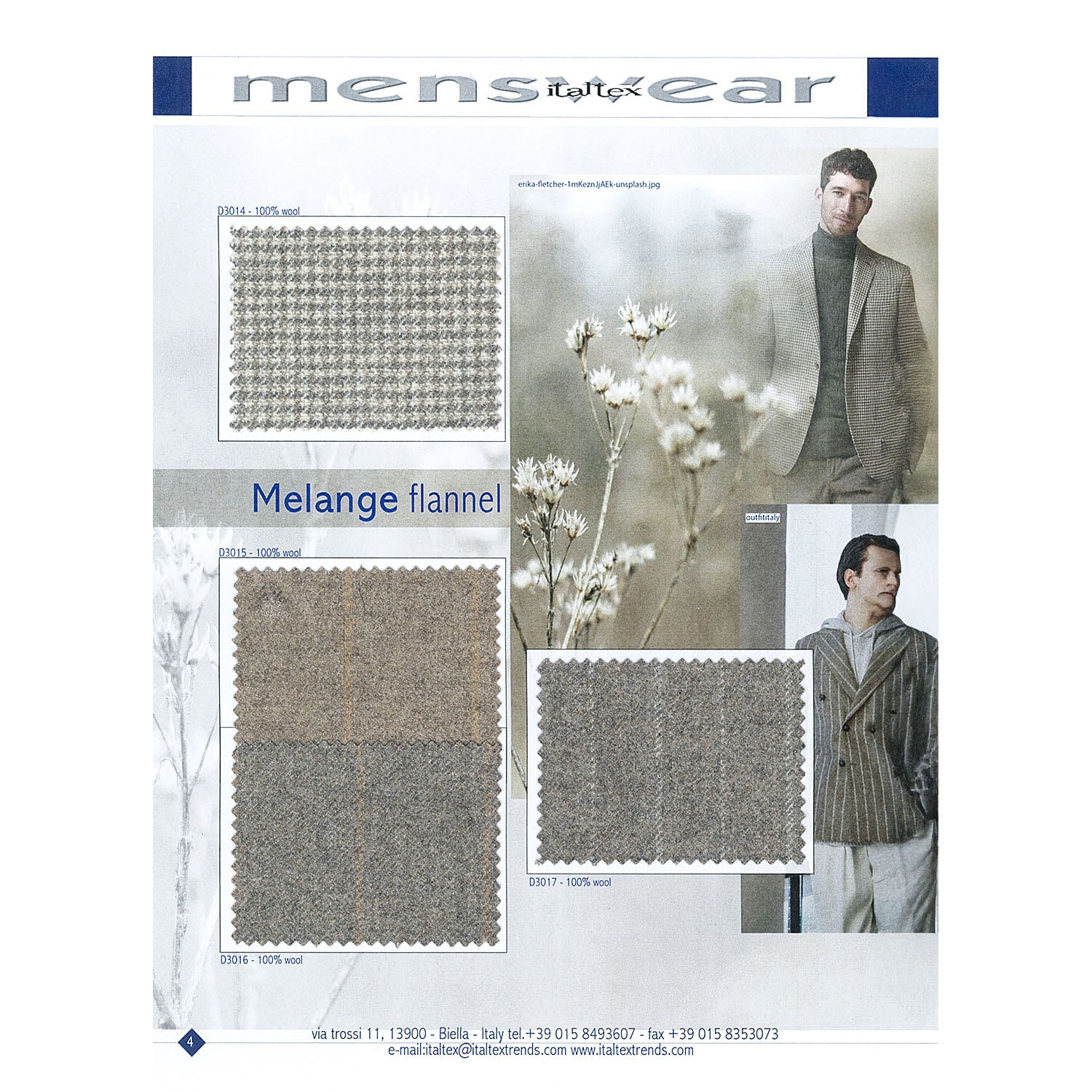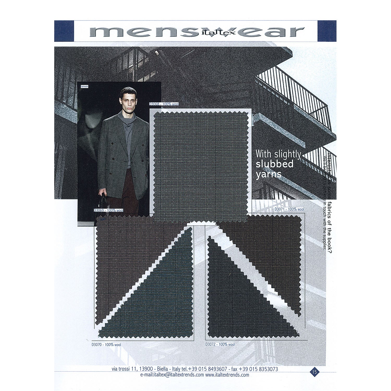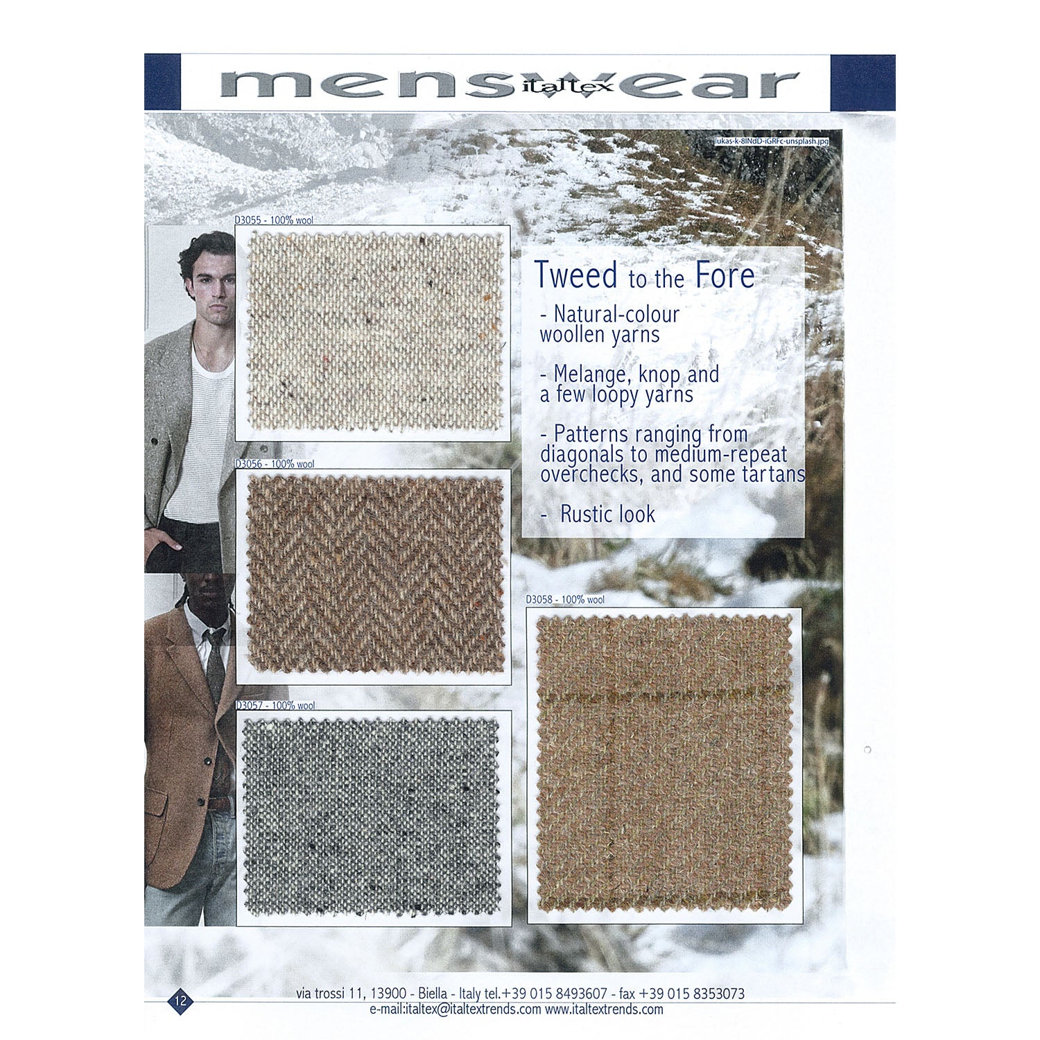 Al suo interno sono inclusi campioni di tessuti in essere selezionati dagli esperti di Italtex Trends, che presentano composizioni, filati, costruzioni, disegni e finissaggi per giacche, pantaloni, abiti e cappotti da uomo. I 74 nuovi colori della stagione sono inclusi in una cartella colori corredati dai relativi codici Pantone®.