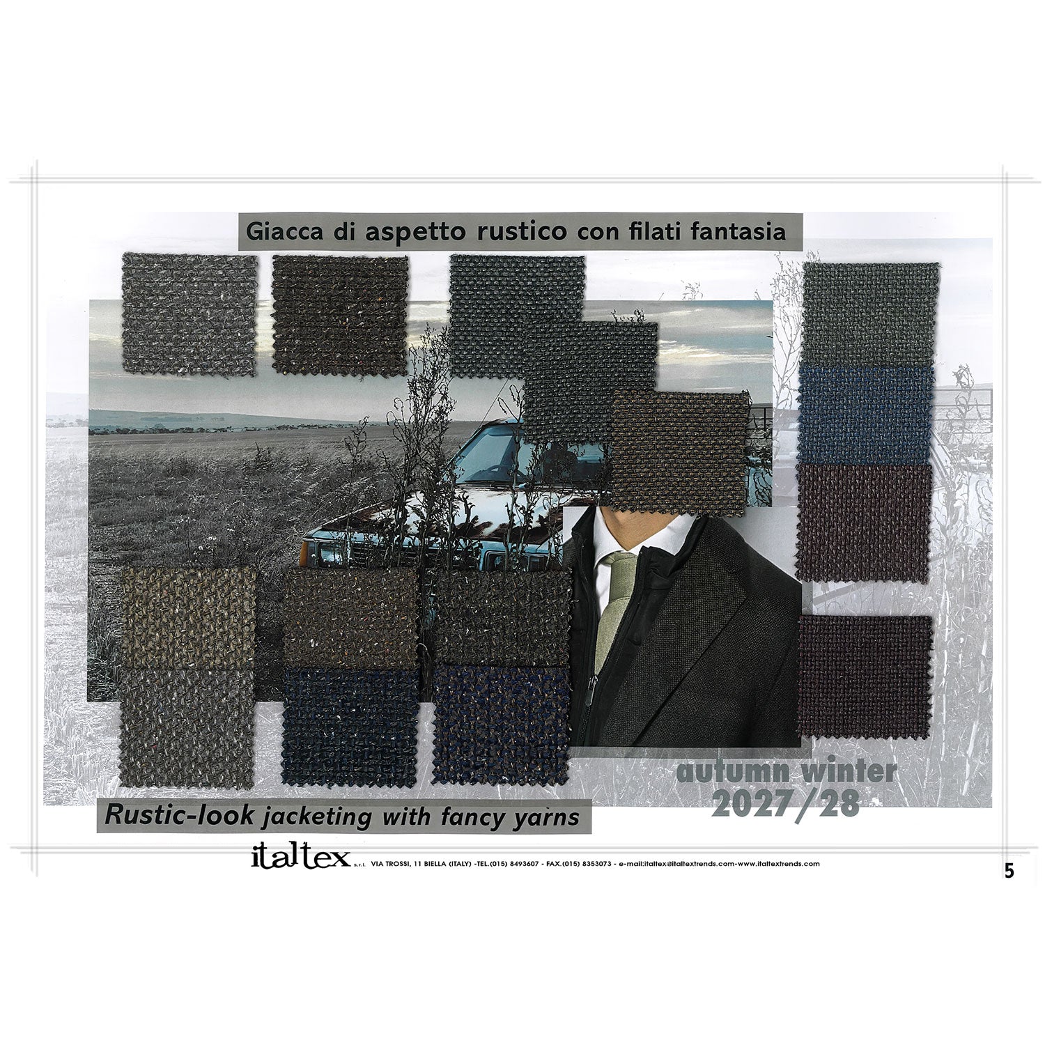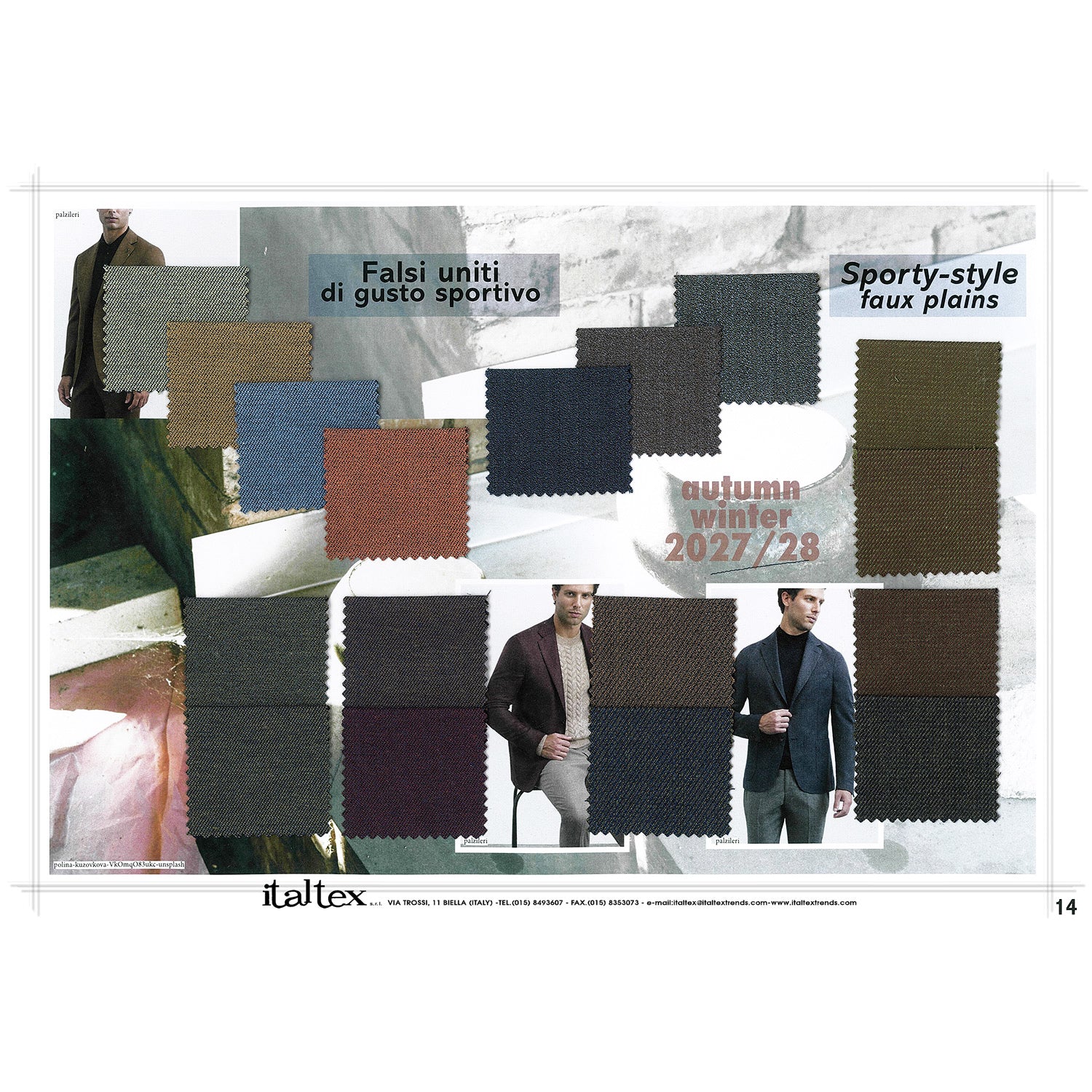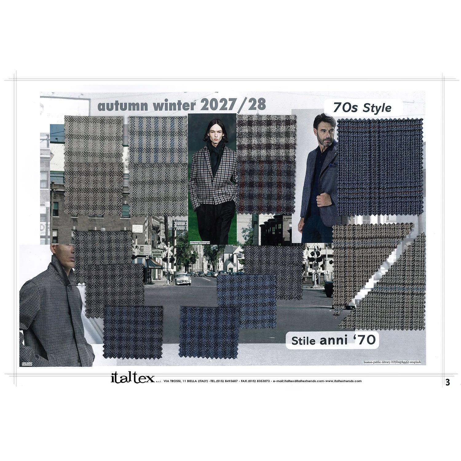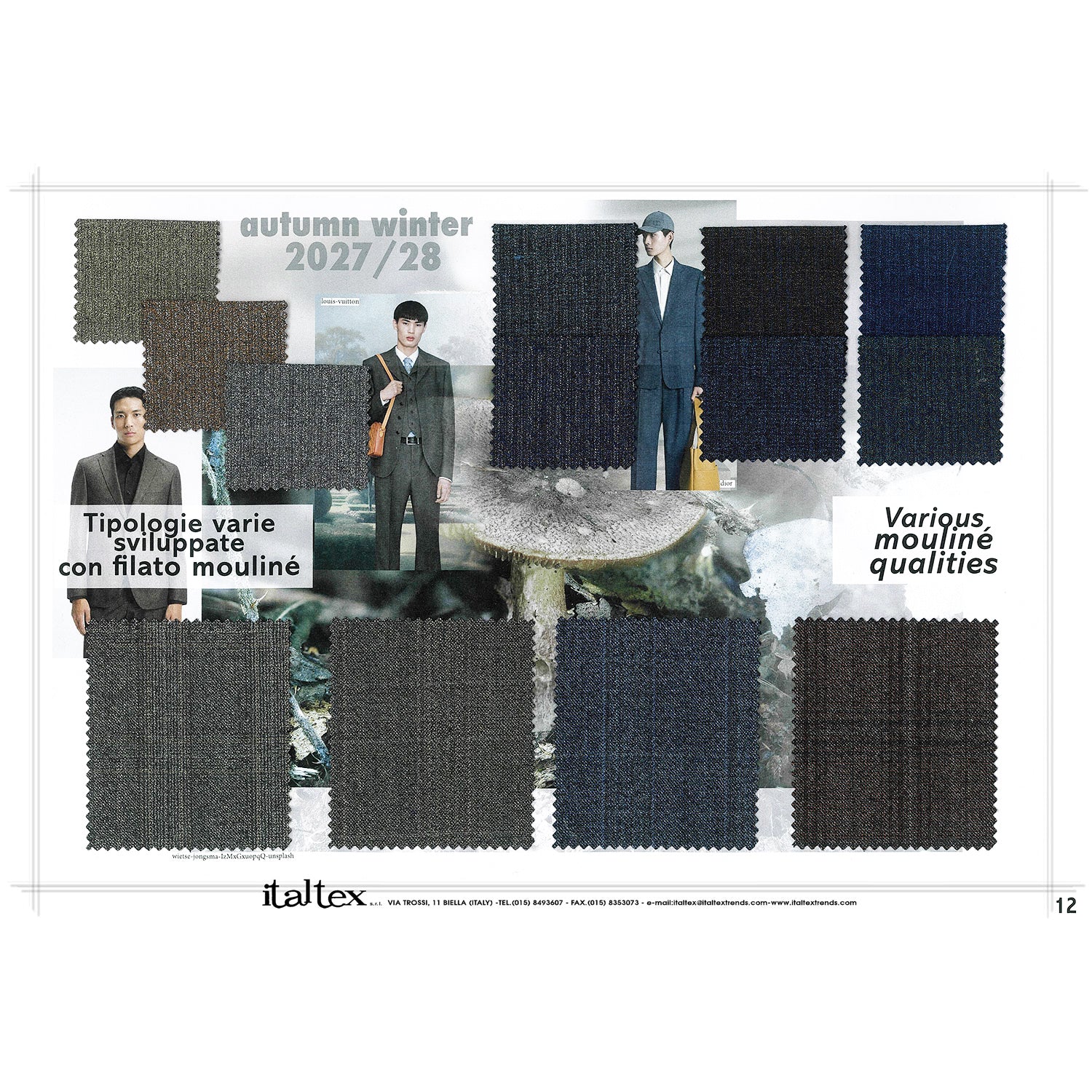 Il quaderno di tendenza moda tessuti con scenari per l'abbigliamento maschile della stagione Autunno/Inverno 2027/2028. Al suo interno, sono proposte 26 cartelle tematiche, che presentano le tendenze di colori, qualità e disegni dei tessuti per abiti, giacche, cappotti e pantaloni per l'abbigliamento di tutti i giorni o la cerimonia.